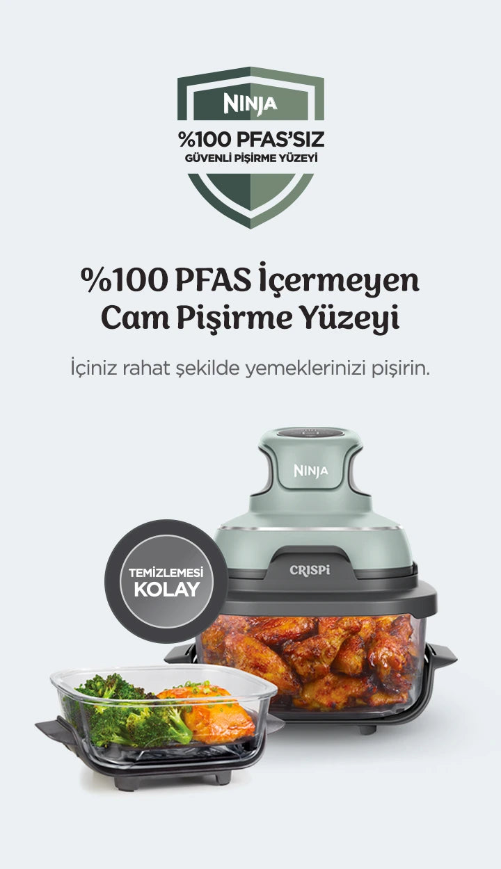 Yeni Ninja CRISPi™ 4’ü 1 arada taşınabilir cam hazneli pişirme sistemi, 1700W’lık hafif PowerPod'u cam haznelerle birleştirerek ister kişisel öğünler, ister aile yemekleri hazırlamanıza olanak tanır. Üstelik fanlı fırınlara göre daha az enerji tüketimiyle.