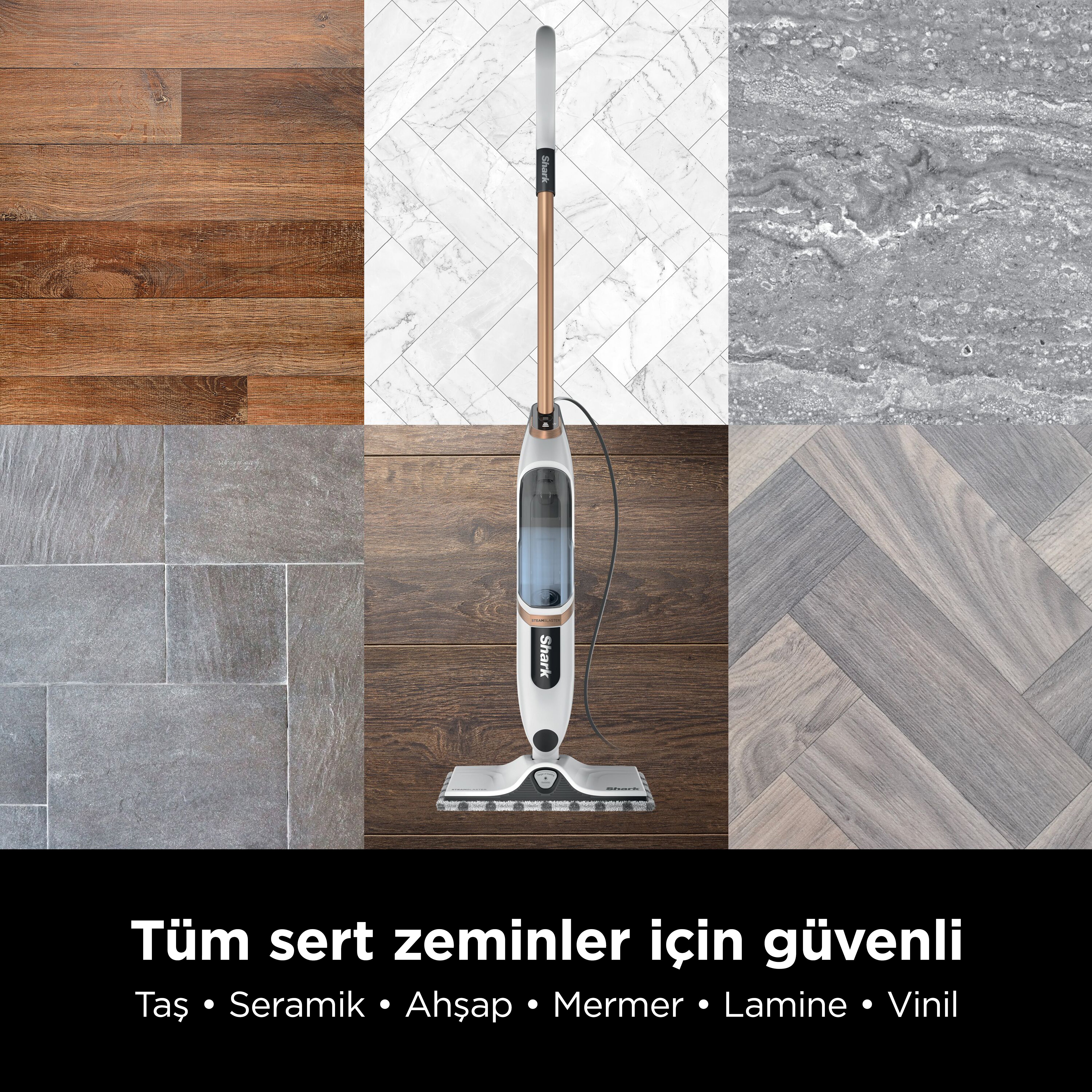 Zorlu kir ve lekeleri etkili şekilde temizlerken; cilalı ahşap, laminat, vinil, fayans, taş ve mermer gibi sert zeminlere nazik davranır.