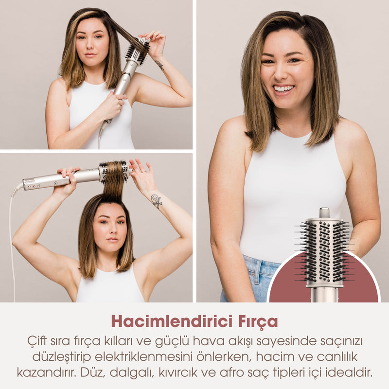 Otomatik Sarımlı Bukle Maşası (Auto-Wrap Başlık): Coanda Teknolojisi, saçı gövde etrafına sarmak için hava gücünü kullanarak otomatik olarak sarar ve kıvırır. Tutamlara ayırdığınız saçınızı maşa başlığına yakınlaştırdığınızda özel teknolojisi saçınızı otomatik olarak sarar ve saniyeler içinde kusursuz bukleler oluşturur. İki ayrı bukle maşası ile saçlarınızı her iki yönde de kıvırarak yüzünüzü simetrik olarak çerçeveleyen bir görünüm elde edin.